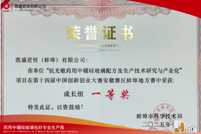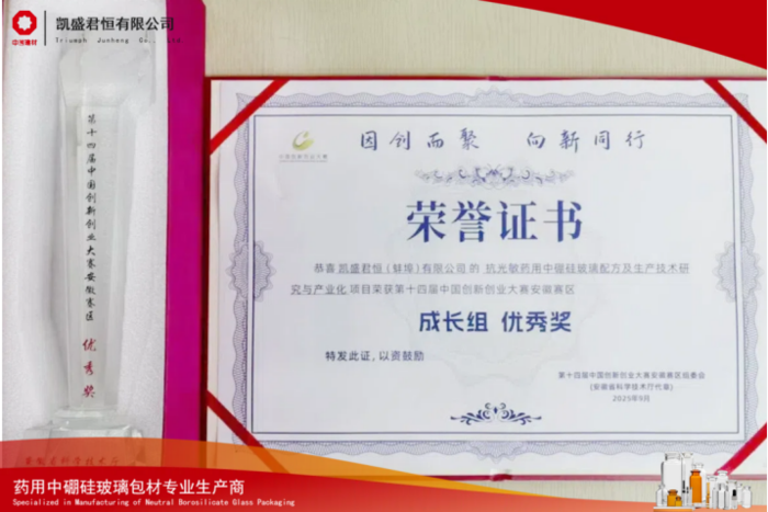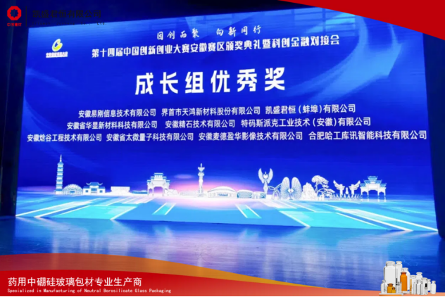 凯盛君恒(蚌埠)有限公司 第十四届中国创新创业大赛连获佳绩 晋级全国赛2025年9月,根据安徽省科学技术厅发布的《关于公布第十四届中国创新创业大赛安徽赛区总决赛结果的通知》(皖科成果秘〔2025〕271号),凯盛君恒(蚌埠)有限公司凭借“抗光敏药用中硼硅玻璃配方及生产技术研究与产业化”项目,在第十四届中国创新创业大赛中先后荣获蚌埠市地方赛成长组一等奖、安徽赛区总决赛成长组优秀奖,并成功晋级全国赛。