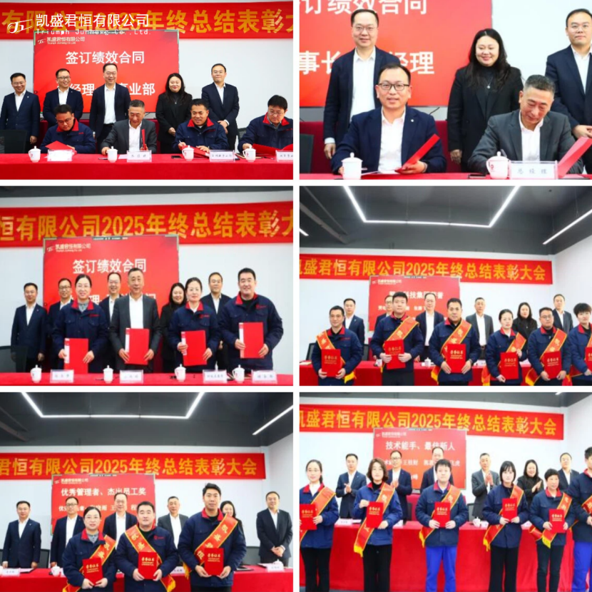 总经理王晓轩在报告中指出:2025年凯盛君恒聚焦各项工作,持续夯实高质量发展根基:一是市场转型成效显著,管转瓶结构实现根本性改善,渠道体系日趋完善。二是产品品质与资质双提升,生产合格率稳步走高,为高端市场拓展筑牢基础。三是研发创新成果丰硕,核心技术实现突破,创新产品完成样品下线。四是品牌建设多维发力,品牌行业影响力持续增强。 2026年公司将以“三抓实一推进”统筹各项任务:抓实产品结构优化,深耕高端技术创新;抓实国际渠道建设,推进产品国际化进程;抓实研发创新攻坚,深化工艺革新提效赋能;稳步推进基地项目建设,高端玻管稳定量产,为企业长远发展积蓄动能。 会上,董事长王伟、总经理王晓轩与各事业部及职能部门负责人签订2026年度目标考核责任书,明确奖惩机制,彰显君恒人全力以赴、使命必达的决心与信心。此次会议表彰了荣获集团先进单位、先进集体、劳动模范、先进工作者奖项,以及君恒先进集体、优秀管理者、杰出员工、优秀员工、技术能手和年度最佳新人奖的集体和个人,以榜样力量激发全员工作热情。 各事业部代表依次发言,分享在市场开拓、技术攻坚、产品迭代中的实践经验,表达了2026年立足本职工作助力公司高质量的坚定决心,引发全员共鸣。